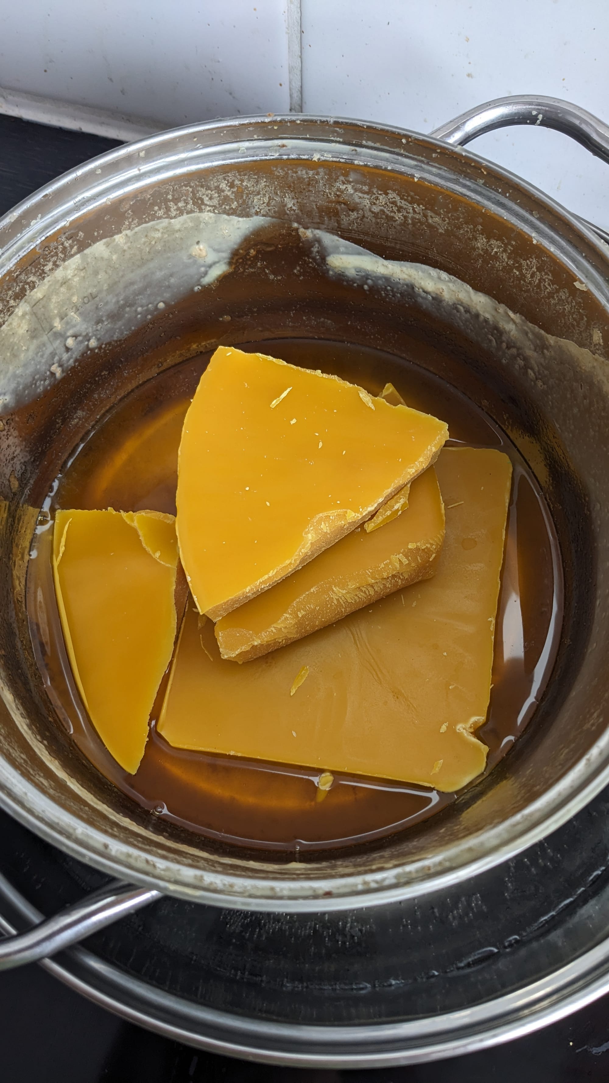 Diese Waben werden aus Hygienegründen entnommen und eingeschmolzen. Dafür habe ich einen Wachsdampfschmelzer verwendet. Beim Schmelzen läuft das flüssige Wachs durch kleine Öffnungen, wodurch der grobe Schmutz bereits entfernt wird. Anschließend sollte das Wachs sehr langsam abkühlen, damit feine Schwebeteilchen Zeit haben, sich am Boden abzusetzen.