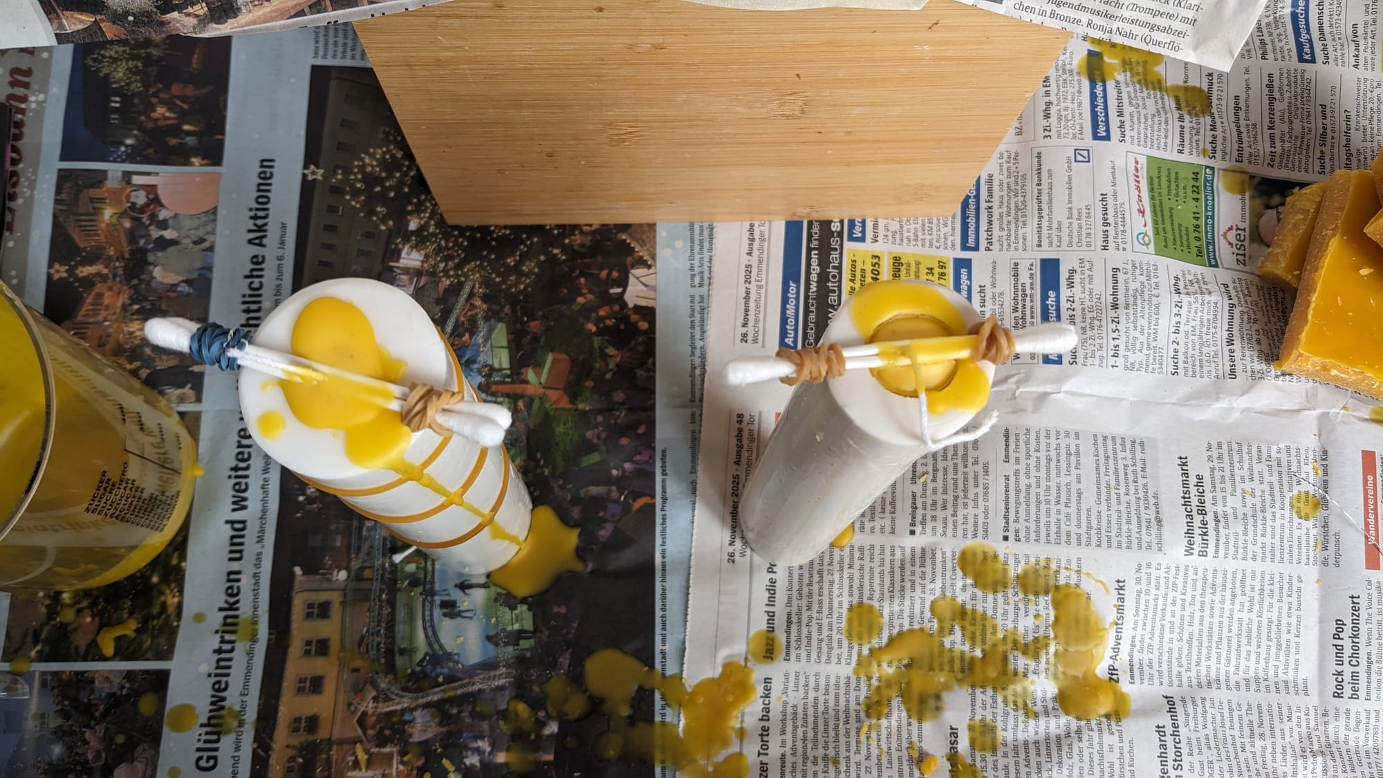 Die Kerzen benötigten im Schnitt etwa 20–30 Minuten zum Abkühlen. Mit nur drei Formen kann die Verarbeitung selbst eines kleinen Wachsblocks dann schnell zur Geduldsprobe werden. An diesem Tag habe ich für 16 Kerzen rund sechs Stunden gebraucht. Natürlich kann man in der Zwischenzeit andere Dinge erledigen – aber die Wohnung verlässt man besser nicht. Die Lösung lautet hier wohl: mehr Kerzenformen oder eine größere Portion Geduld. Bei mir werden es definitiv die Formen.